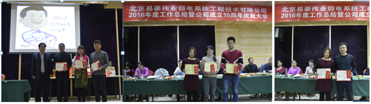 靈猴辭舊歲,金雞迎新春,2017年2月11日上午,北京易豪偉業(yè)弱電系統(tǒng)工程技術(shù)有限公司2016年度工作總結(jié)表彰暨公司成立15周年慶祝大會(huì)在懷柔鵝和鴨山莊隆重舉辦。北京總公司、江蘇分公司、成都分公司、山東分公司全體員工歡聚一堂,總結(jié)過(guò)去、研討未來(lái)、表彰先進(jìn)、共迎新春,會(huì)議由總經(jīng)理助理靳總主持。